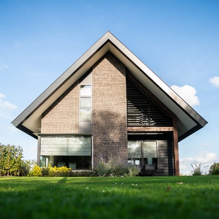 Idyllic freestanding house set amid Dutch meadowland. Built in 2022. Floor-to-ceiling window units appear to flood the interior with greenery. The FIN-Project window model, with its slender aluminium frames on both inside and outside, creates an agreeable contrast to the stone façade and boldly overhanging roof. The large areas of glazing that protrude into one of the roof planes fill the interior with the light and warmth of the sun to create a special homely feel.