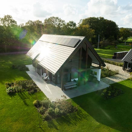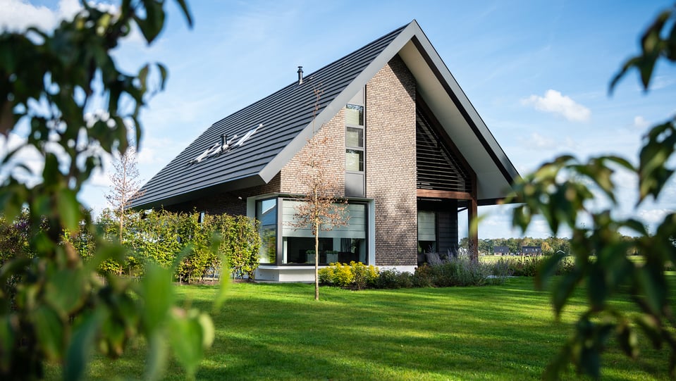 Idílica casa de campo en un mar holandés de prados. Construida en 2022. Las ventanas en toda la altura permiten que la vegetación fluya hacia los espacios habitables. La ventana FIN-Project, con sus estrechos perfiles en aluminio en el exterior y el interior, crea un armonioso contraste con la fachada de piedra y el llamativo techo saliente. Gracias a las grandes superficies acristaladas que atraviesan una de las dos alas del tejado, la luz del día y el calor solar inundan los interiores y crean una atmósfera vital especial.