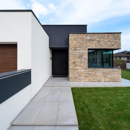 È evidente fin dal primo sguardo: costruita nel 2023, questa villa unifamiliare di classe energetica A4, è un connubio di materiali. La compresenza di svariati tipi di pietra, la muratura liscia e l’utilizzo dell’alluminio valorizzano le caratteristiche estetiche dell’edificio. Le ampie vetrate proposte da Finstral realizzano estese superfici trasparenti, rafforzando il collegamento visivo tra interno ed esterno. Le pareti vetrate FIN-Vista, grazie alle linee minimaliste Nova-line Plus, e le grandi ante della porta alzante scorrevole FIN-Slide proiettano l’area abitativa verso l’esterno. Le finestre, dalle dimensioni variabili, si contraddistinguono per il loro impatto elegante e slanciato. Il telaio in alluminio, con una superficie finemente strutturata, produce un impatto visivo sofisticato e omogeneo, sia all’esterno che all’interno.